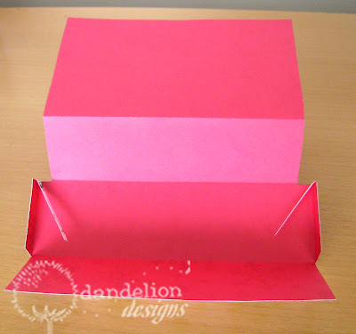 Notice how the bottom piece slips into the "pocket" of the top piece...also, notice how the 2 green dotted tabs slip under the 2 white side tabs. Are you still following me? The next step is to put double stick tape on those 2 white tabs and fold the last bottom section up as shown below: