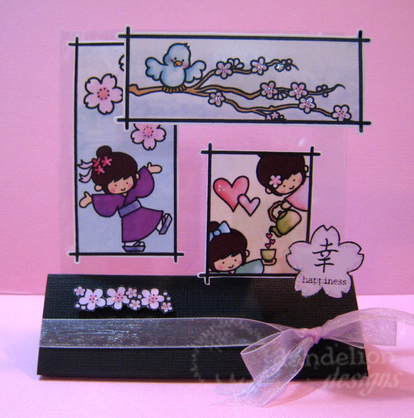 I found these really cute notepads at Ben Franklin...they're all ready for you to decorate any way you choose! I used the panel with the happy kimono girl and the sakura. I stamped, colored and cut out a couple of extra sakura blossoms (back and front held together with a foam dot) to dangle from the gold cord. Plus, I added a few images to the back of the notepad: