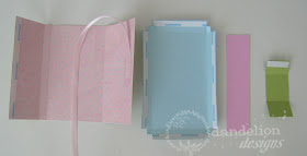 Place double stick tape in the places shown in the photo above. For the first (pink) piece, use scotch tape to attach a 12" piece of ribbon as shown. (Please also note placement of the ribbon...this is important too!!)
